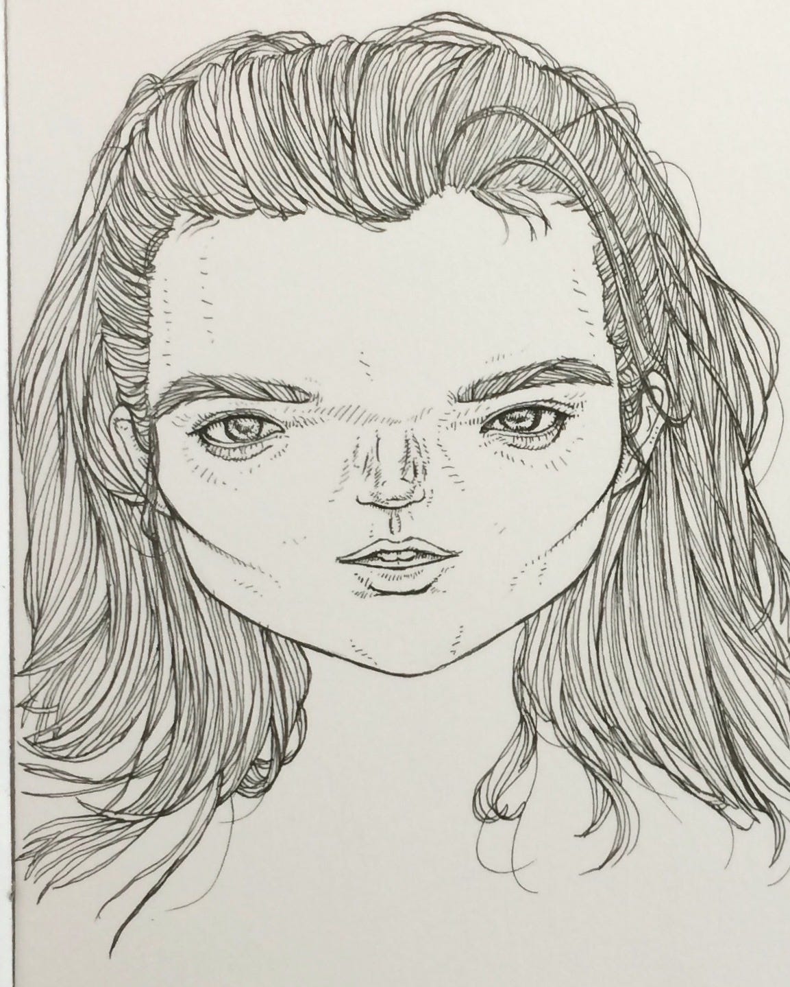 I’m creating the shape of the girl’s face, which is always the hardest part for me, to make it symmetrical; I like it stately but not too masculine. I have a tendency of going too boxy on the left and soft on the right so she only has one jawbone or is turned to the side (see above), but I can’t change perspective because the eyes are already there, and the nose, the mouth, it’s all established. But now it’s considerably harder as I have a shadow, my own shadow, obscuring the lines, and I can’t move out of my own way. I don’t want the guy to think I’m penetrable. Ten, twenty more seconds and he’ll go away. Be strong.